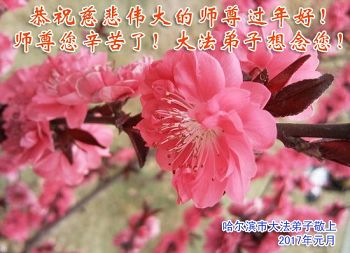 师父辛苦了!梅花傲雪,不惧风霜,弟子会努力做好师父要求的三件事,请师父多些欣喜,多些微笑。 吉林省公主岭市大法弟子 二零一七年年新年敬贺 黑龙江哈尔滨市大法弟子恭祝慈悲伟大的师尊过年好!
