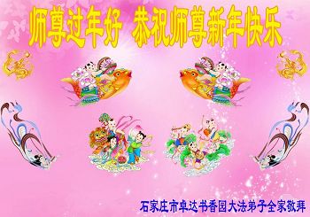 天津市河东区老年夫妇携全家十人(其中大法弟子七人)叩首,恭祝伟大慈悲的师尊新年快乐!向师父拜年! 河北省石家庄银通小区大法弟子恭祝师父新年快乐!师父辛苦了!