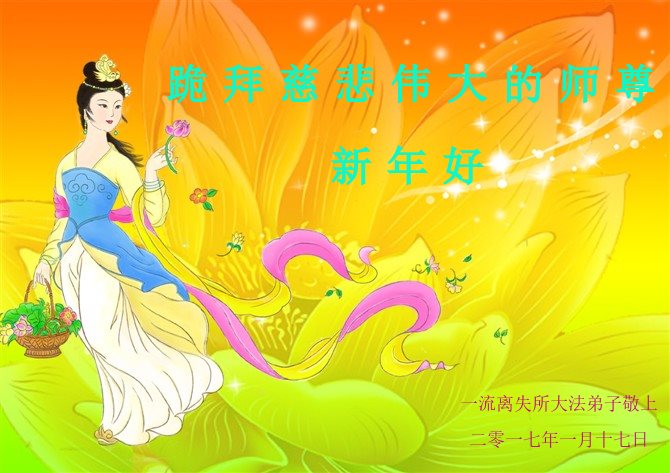 时间如水流,转眼间二零一七年新年到来了,借此新春佳节之际,恭祝慈悲伟大的师父新年快乐! 师父过年好!师父辛苦了!弟子们一定做好三件事,以弥补以前的过失,放下一切执着,完成史前誓约,救度众生。唯愿师尊笑! 潍坊高密城北区学法小组大法弟子 山东省威海市荣成市寻山镇一家学法小组大法弟子恭祝慈悲伟大的师尊新年快乐!