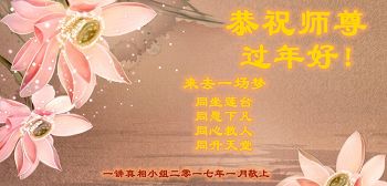 师父好,我们学法小组大法弟子给师父拜年,问候师父新年好。我们用任何语言都无法表达对师父的敬意和感恩。在新的一年里,我们扎扎实实的修,时刻想到自己是炼功人,走师父安排的路,学好法多救人,让师父少操心,多一些欣慰。我们集体遥祝师父新年快乐! 山东诸城大法弟子