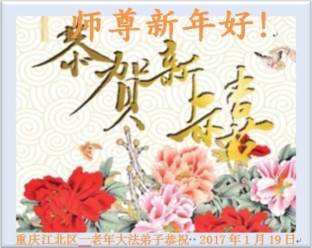 恭祝慈悲伟大的师尊新年好!感谢师尊慈悲苦度! 新年弟子更精進,学法修心多救人,兑现誓约报师恩,功成圆满随师还! 重庆江北区一老年大法弟子恭祝 2017年1月19日 山东东营西城中老年学法小组恭祝师尊新年快乐!