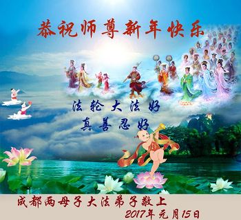师尊辛苦了! 我们是辽宁抚顺望花母女二人大法弟子,感恩师尊的慈悲看护,在过去的一年里,弟子经历风风雨雨走了过来,在修炼中有很多不如意的地方,在新的一年里,我们母女二人一定会学好法,多学法,修好自己,互相促進,共同提高,配合好,多救人,兑现誓约。不辜负师尊的慈悲苦度! 辽字抚顺望花母女二人大法弟子敬上 二零一七年一月十九日 四川省成都两母子大法弟子恭祝师尊新年快乐!