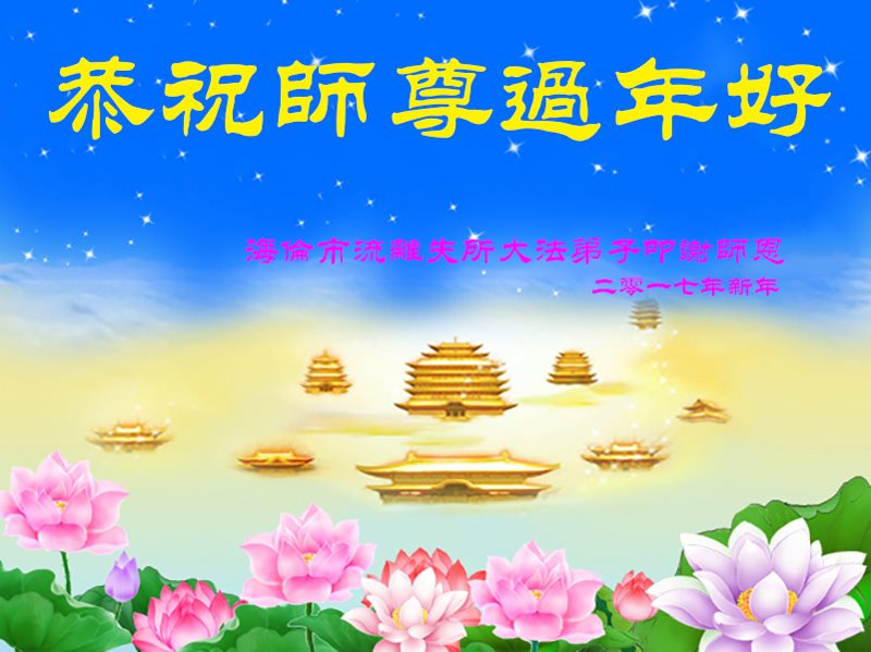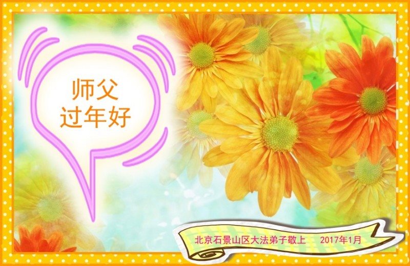 师父好!门头沟全体大法弟子送上新年的祝愿,感恩师尊的慈悲救度之恩!弟子要不辜负师尊对我们的殷切期望,加紧做好。 辽宁省抚顺一大法弟子恭祝师尊新年好!