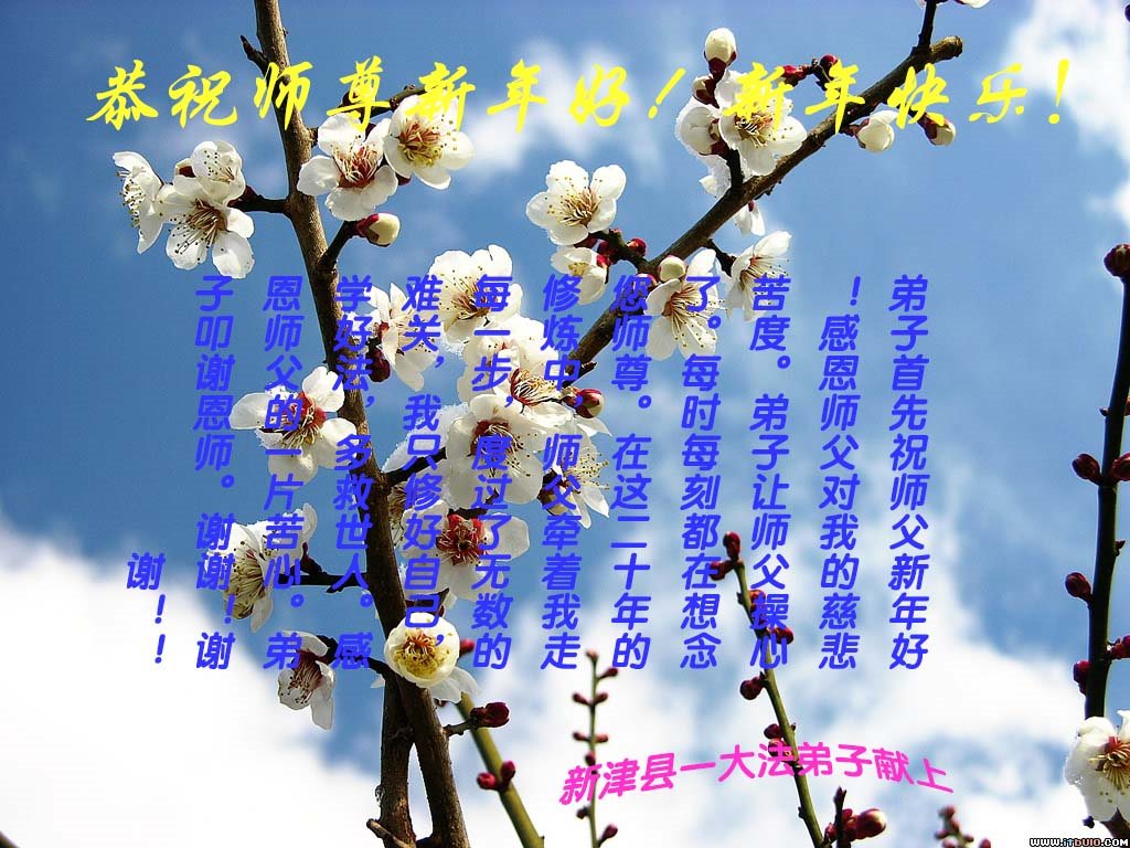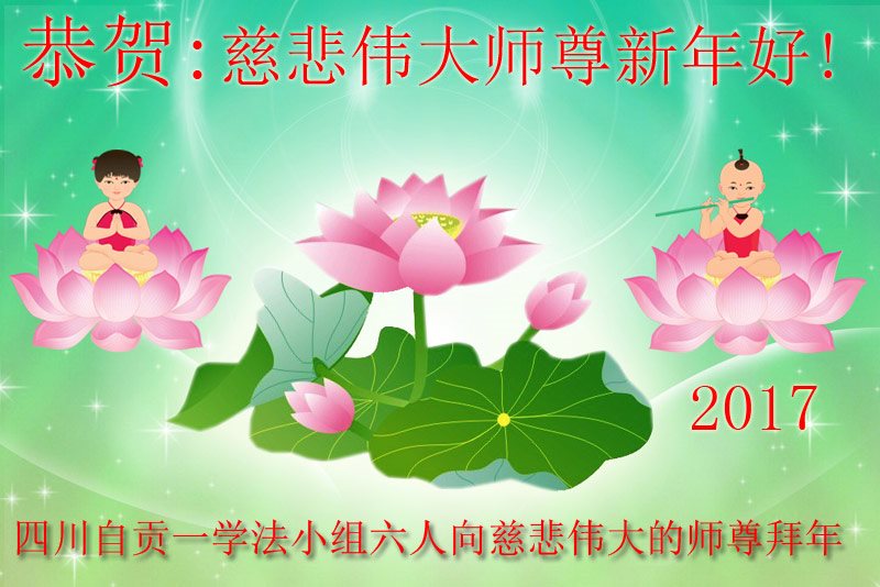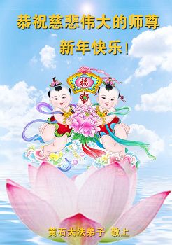 慈悲伟大的师父辛苦了!师父把我们从地狱捞起洗净,为度成我们,师父为我们承受了我们的一切苦难,给予我们太多太多。弟子无法报答师恩,唯有精進再精進。在新的一年里,我们学法小组全体大法弟子学好法,以法为师,做好三件事多救人。互相包容去掉人心,走好助师正法的修炼路。让师父多一份欣慰,少一份操劳。 四川省成都市新津县一大法弟子恭祝师尊新年快乐!