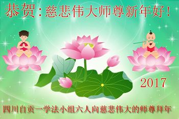 师父您辛苦了!弟子们叩拜师恩!愿师父在新的一年里少一份操劳,多一份欣慰。弟子们会牢记师尊的教诲,多学法,在修好自己的同时,做好三件事,更快更多的救人,不辜负师尊的慈悲苦度。 四川自贡一学法小组全体大法弟子恭祝慈悲伟大的师尊新年快乐!