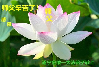 刚刚走过的一年里,弟子真切的感知到人心对正法的阻挡,以及正信大法的无边威力。 新的一年,弟子惟愿在师尊加持之下,继续牢记使命,用大法赋予的全部的智慧和力量,证实大法的伟大!会更加努力,听师尊的话,修好自己,快救人、多救人。不辱使命、兑现誓约,回报师尊的慈悲救度之恩!” 四川遂宁市青莲学法小组大法弟子跪拜 |