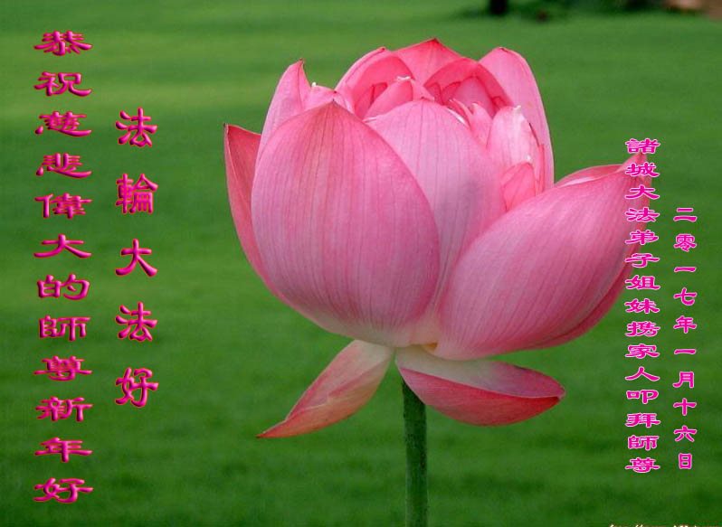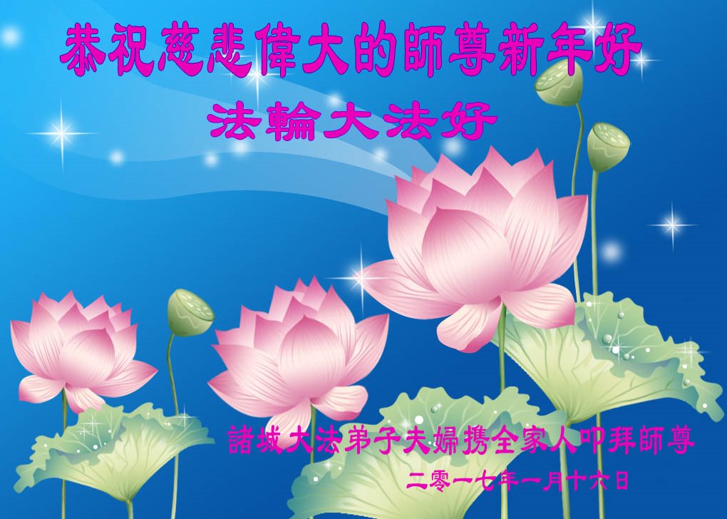 师父新年好! 河北省石家庄市平山县一家大法弟子恭祝师父新年快乐! 在师父的慈悲看护下,我们一家走过这十几年的修炼道路,记不清多少次难或苦的经历都成为升华心性的机会,也是大法洗净我们心灵的过程。弟子们真正认识到师父成就大法弟子的艰辛。法理的明悟使弟子们对师父、对法越来越坚信坚定。 师父的洪恩浩荡,用尽人间语言都远不足表述,弟子们感恩师父!感恩师父!感恩师父!弟子们会继续好好学法,好好修心,好好做三件事。弟子们想念师父,盼师父回来! 再次恭祝师父新年快乐! 北京和平里地区大法弟子恭祝慈悲伟大的师尊新年好!