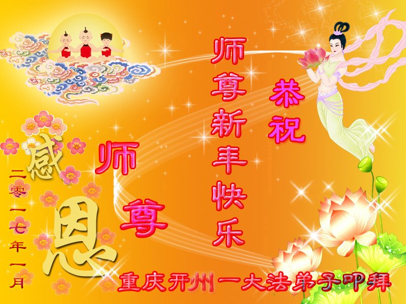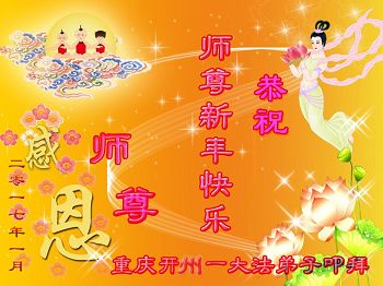 师父您好!首先恭祝师父过年好! 弟子无法用语言表达对师父的感恩,只有实修自己,做好三件事,让师父多一份欣慰,不辜负师父的慈悲救度。 谢谢慈悲伟大的师尊! 叩拜师父! 石家庄谈固大法弟子 2017年1月15日 重庆开洲一大法弟子恭祝慈悲伟大的师尊新年快乐!