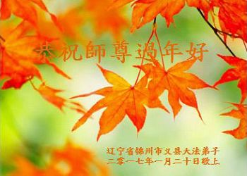 新年即将来临的时候,我们夫妻俩向恩师致以最亲切的问候!恭祝伟大慈悲的师尊新年好!新年快乐!我们要学好大法,深刻领会、理解大法,去掉人心,遇事找自己,尽一切去讲述真相,多多救人,跟师父回家。 四川省遂宁市一老年夫妻大法弟子 叩拜 二零一七皇历丁酉年新年 黑龙江佳木斯一大法弟子恭祝师尊新年好!