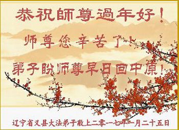 请师父放心,在新的一年里,我们全家坚决按照大法的要求认真做好三件事,精進实修,助师正法,早日回家。 湖北省咸宁市大法弟子恭祝师父新年好!