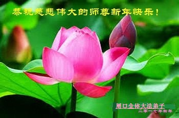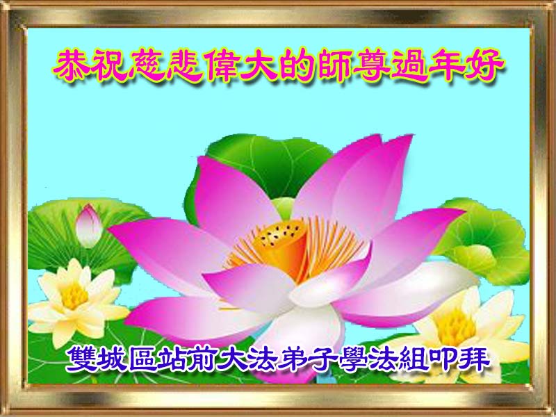 两朵莲花一颗心, 喜得大法泪纷纷, 横心修炼去执着, 三件事要用心做, 分分秒秒救众生, 功成圆满见师尊。 千言万语言不尽, 万语千言谢师恩。 师父,我们想念您! 让您辛苦了! 河南省周口全体大法弟子恭祝师尊新年快乐!