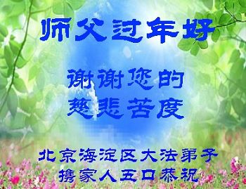 只有听师父的话,按照大法的标准修好自己,才是对师父最好的感恩! 北京海淀区大法弟子携家人五口恭祝师父过年好!谢谢师父的慈悲苦度!