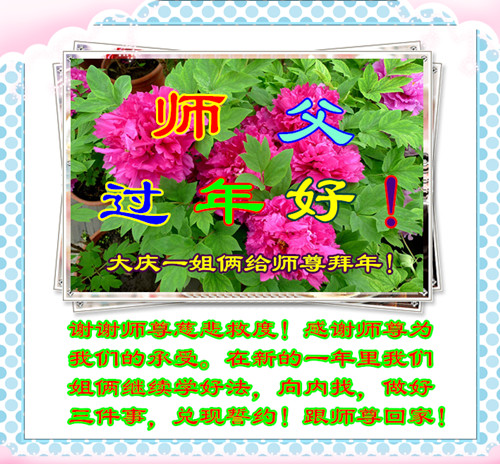 辽宁省大连开发区大法弟子果莲、清风恭祝慈悲伟大的师尊过年好!师尊节日快乐!