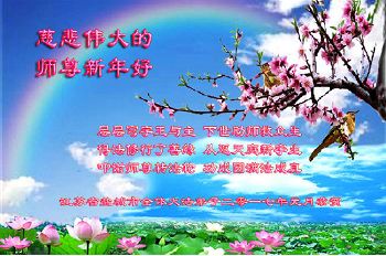 感恩师尊对弟子的慈悲救度与看护!弟子会在新的一年里努力做好三件事,多学法,对照法实修自己,努力做好讲清真相。最后再次恭祝师尊新年快乐!弟子跪拜! 吉林省白城大法弟子恭祝慈悲伟大的师尊新年好!