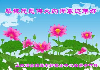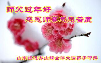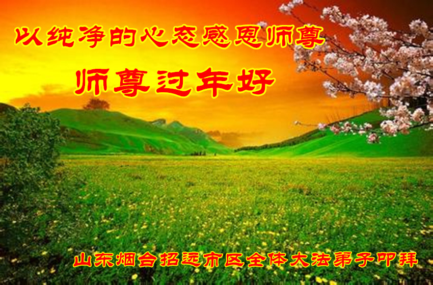 在新年来临之际。北京首钢全体大法弟子恭祝师尊过年好!修炼不容易,坚持到底更不容易,靠的就是对师尊的坚信,对法轮大法的坚信,无论天塌地陷、雾霾漫天,弟子们都会一如既往,做好三件事,去掉安逸心和虚荣心,听师尊的话,把对师尊的感恩,化成救人、讲真相的动力,真修实修,跟师尊回家。 北京石景山首钢大法弟子 跪拜敬上 山东烟台招远齐山镇大法弟子恭祝师尊过年好!