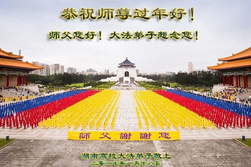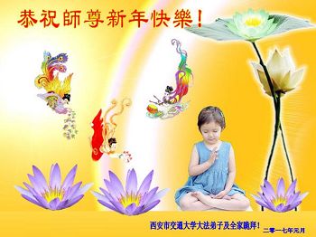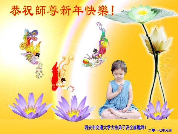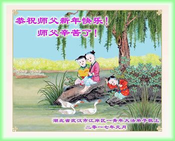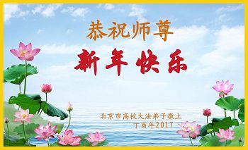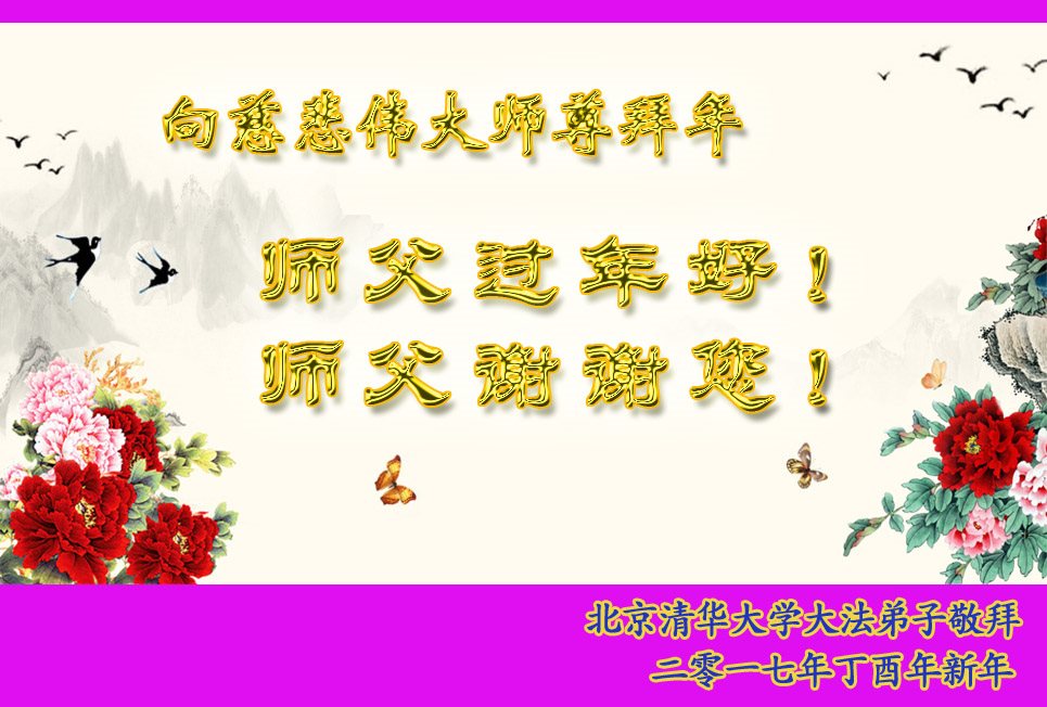 | 【明慧网二零一七年一月二十五日】新年到来,中国大陆各地高校和各行各业青年大法弟子给师尊拜年! 在道德败坏、天灾人祸连连不断的当今社会,人类的出路在哪里?人类的未来将会怎样?对生命和人生不断探索的青年学子有这样的疑问。 清华大学大法弟子写道:“古今中外上所有著名预言都提到了,人类走到最后时,会有一件大事发生,留下来的人类将走入无比美好的新纪元。”“真善忍宇宙大法传出,在挽救人类的道德,救度末劫危难中的众生,给人类给宇宙带来无限的光明和希望。” 北京一组年轻弟子表示,救度众生中他们体会到了使命感和幸福感,“虽然地处邪恶中心,但不觉的有压力。因为信师信法,知道师尊在身边,做的又是世界上最正的事”。 黑龙江省青年大法弟子感恩师尊:“历尽了多少艰难经历了多少坎坷,您都鼓励我们面对挫折才能超脱自我。”一位伊春市大法弟子表示,十八年后还能做师父的弟子,师父依然慈悲看护他,让他感到无比幸福。 湖南科技大学大法弟子对师父说:“您为弟子操尽了心,您为我们受苦了!在修炼的路上您不断的指点、修正我们各种不正的人心,使我们越来越纯净。” 南京师范大学全体大法弟子恭祝慈悲伟大的师尊过年好!叩拜师尊!谢师恩!湖南郴州全体青年大法弟子恭祝慈悲伟大的师父新年快乐!北京清华大学大法弟子向慈悲伟大师尊拜年!金鸡唱晓开新日 阴霾扫尽复青天 二零一七丁酉年新年来临之际,北京清华大学大法弟子向至尊至敬至高无上慈悲伟大的师父致以最崇高的敬意!恭祝慈悲伟大师尊丁酉年新年快乐!师父过年好!师父谢谢您!师父您辛苦了! 当今社会,道德败坏、天灾人祸连连不断的,人类的出路在哪里?人类的未来将会怎样?古今中外上所有著名预言都提到了,人类走到最后时,会有一件大事发生,留下来的人类将走入无比美好的新纪元。人类逐渐会明白,是至高无上的伟大师尊的无量慈悲,将“真、善、忍”宇宙大法传出,在挽救人类的道德,救度末劫危难中的众生,给人类给宇宙带来无限的光明和希望。 我们无限感恩伟大师尊的慈悲救度,要更加珍惜这万古不遇的修炼机缘,学好法精進不怠,广传真相多救人,跟师父回家。 北京清华大学大法弟子丁酉年新年敬拜,合十! 西安交通大学一学法小组大法弟子及家人恭祝师尊过年好!感恩师尊!师尊您好!师尊您辛苦了!恭祝师尊过年好! 我们一定听师尊的话,学好法,做好三件事,圆满随师还。 西安交通大学一学法小组大法弟子及家人叩拜师尊! 二零一七年一月 中国科技大学全体大法弟子给师尊拜年!恭祝师尊新年快乐!中国科技大学全体大法弟子在新年到来之际,叩拜师尊!弟子们想念师尊,在新的一年里弟子们会珍惜师尊延续来的时间,整体配合好,做好三件事,多救世人,不负师尊的慈悲苦度!唯有精進再精進,才能对得起师尊的慈悲苦度。恭祝师尊新年快乐! 吉林大学一学法点大法弟子恭祝师尊新年快乐!北京石景山、海淀、东城大法弟子恭祝师尊过年好!师尊过年好! 我们这个学法小组的学员都很年轻,在同一个单位上班,来自北京不同地区。修炼法轮大法后身心受益,更觉众生生命的可贵,救人的重要。 有时上班看到楼下有卖唱的流浪者,我们就会下楼送给他们一张真相光碟,告诉他们看完光碟,歌儿会唱的更好,同时给他们讲真相做“三:退.”。出去办事,会利用路上的时间发真相册子、赠送真相年历,讲真相,都是面对面的做。买饭都用真相币,随时用随时打印。虽然地处邪恶中心,但不觉的有压力。因为信师信法,知道师尊在身边,做的又是世界上最正的事,很有使命感和幸福感。工作之余有空就学法。 老板很信任我们,财务方面的事都不回避我们,存折密码等我们都知道。去年过年,我们把两张篆字体的“法轮大法好”、“真善忍好”的剪纸贴在办公室的门上,很喜气。 在工作中修炼自己的心性,发现不足,及时在法中归正。 修炼是幸福的,幸福来自于学法。知道了做人的道理,把这份幸福传递给众生,并让众生知道真相是我们的责任和义务。 北京石景山、海淀、东城大法弟子跪拜 敬祝 吉林大学公共外语教育学院大法弟子恭祝慈悲伟大的师尊新年快乐!东北师范大学大法弟子敬祝师尊新年快乐!辽宁新宾县一青年大法弟子恭祝慈悲伟大的师父新年好!湖北省武汉市江岸区一青年大法弟子恭祝师父新年快乐!四川省巴中市一中学大法弟子恭祝慈悲伟大师尊新年快乐!唐山丰润区一青年大法弟子恭祝师父新年快乐!师父过年好!师父辛苦了!弟子叩拜师父,感谢师父的慈悲救度! 陕西省西安市城南高校大法弟子恭祝慈悲伟大的师尊过年好!在新的一年里,弟子要更加精進,向内找,坚持实修,做好三件事,跟师尊回家。 黑龙江省全体青年大法弟子恭祝慈悲伟大的师尊新年快乐!岁月匆匆一年的时光又过 慈悲伟大的师尊又为我们承受了太多太多 然而师尊的辛苦却从来不说 只是承受巨难延长机缘为了我们能够回归天国 一十七载您帮我们度过了多少关难解开了多少迷惑 我们才能在红潮汹涌中正气凛然的闯过 历尽了多少艰难经历了多少坎坷 您都鼓励我们面对挫折才能超脱自我 师尊啊 您为我们承受的太多太多 我们用尽全人类的语言也无法说完道破 唯有在最后有限的时间里兑现史前的承诺 不辜负慈悲伟大的师尊厚望与谆谆嘱托 师尊啊您辛苦了 我们感恩的话想说的太