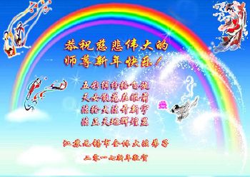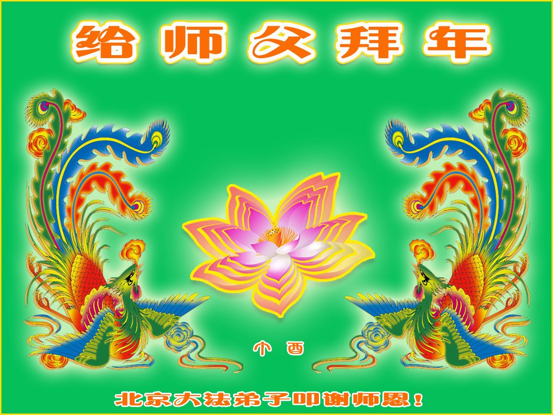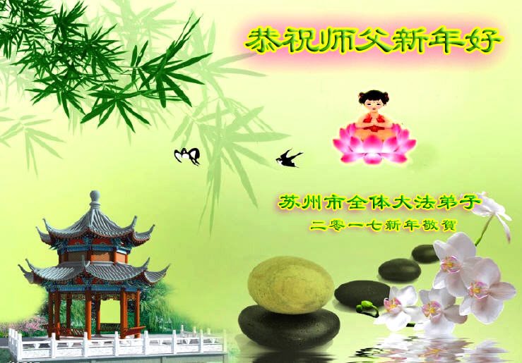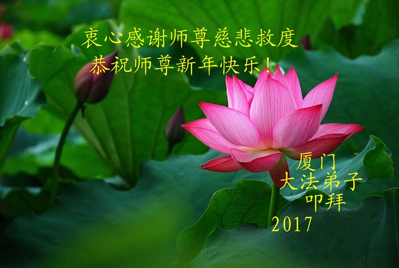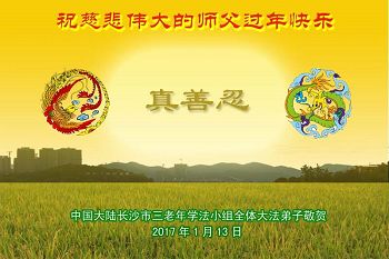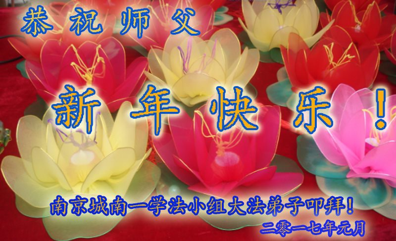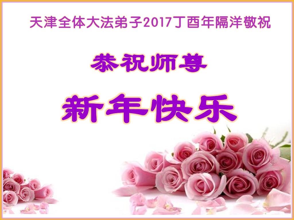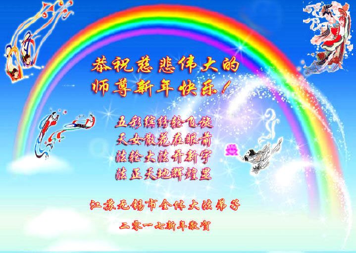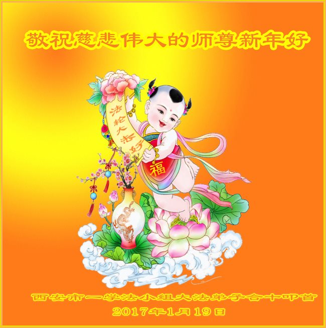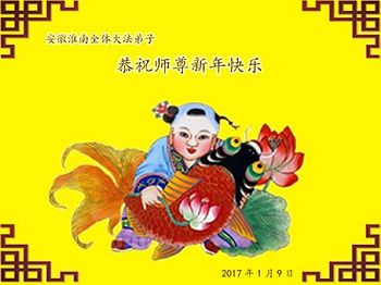 | 【明慧网二零一七年一月二十五日】“飞雪舞新春 朗朗日月新”,“迢迢路万里 弟子谢师恩!”丁酉大年来临,从黑龙江中苏边境到新疆的哈密;从内蒙草原到亚热带的海南,囊括了大江南北黄河两岸中国大陆二十二个省、四个直辖市、以及广西壮族、内蒙古、宁夏回族、新疆维吾尔自治区在内的各地大法弟子,纷纷给师父发来充满喜庆、欢乐的对法轮大法李洪志师父的节日恭贺、问候和感恩,令人倍感温馨! 贵州大法弟子想念师父,他们写道: “新年来临想师尊 青丝白发添几根 唯有精進不懈怠 才慰师尊殷切心”。 新疆大法弟子说:“大法恩泽众生 众生感恩无限 新年就要来临 齐向师尊拜年”! 每张都包涵对师尊慈悲救度的无限感恩和跟随师父一修到底的决心。广东省茂名大法弟子表示,“弟子要以金刚志、磐石心坚修大法,勇猛精進,多学法,按师尊要求做好三件事,助师正法,救度众生”。 甘肃省靖远县大法弟子说:“不论残余的邪恶有多么凶恶,我们都要坚定的做的更好,在维护大法、兑现对师尊的誓言中,尽最大的努力和付出,争取救更多的世人与生命!请师父放心!” 天津全体大法弟子感恩师尊时时的呵护与谆谆教诲,叩谢恩师!天津全体大法弟子不忘师尊教诲,心怀慈悲,救度众生,愿更多众生能登上救度的法船。感恩师尊时时的呵护。 新年之际,天津全体大法弟子叩谢恩师!叩拜恩师! 人生短暂悲与苦,幸得大法红尘出。 精進实修不迷途,师尊慈悲把路铺。 旧势干扰挡前路,弟子立掌炸魔窟。 风雨无阻神佛助,心如净莲正念出。 众生得救皆醒悟,喜迎新春脱寒冬。 今生有幸为法徒,了此夙愿回天宫。 新疆哈密大法弟子恭祝师尊新年快乐!感恩 苍宇太久远 面临大劫难 师尊降慈悲 救度大劫前 众徒随师下凡间 助师正法了洪愿 旧势阻 江鬼乱 师尊挽狂澜 带徒除恶灭乱 真相传遍世间 正法洪势将至 旧势灭 江鬼被审判 大法恩泽众生 众生感恩无限 新年就要来临 齐向师尊拜年 师尊您好!师尊您辛苦了! 新疆哈密大法弟子跪拜师尊 2017年新年 贵州大法弟子恭祝师尊丁酉年好!在丁酉新年到来之际,我们代表贵州全体大法弟子向慈悲伟大的师尊致以崇高的敬意和诚挚的问候:恭祝师尊新年快乐!师尊您辛苦了!感恩师尊的慈悲苦度!弟子们一定遵循师尊的教导,做好三件事,圆满随师还。 漫漫长夜无尽头 雄鸡一唱天大亮 冬去春来挡不住 万物更新众有望 大法就是指路灯 师尊擎灯照前程 弟子随师救众生 横扫烂鬼驱邪灵 天清地透寰宇正 天上人间同欢庆 无量慈悲无言表 弟子叩首谢师恩 新年来临想师尊 青丝白发添几根 唯有精進不懈怠 才慰师尊殷切心 弟子有约与师尊 您的教诲记在心 无论前方有多远 修炼如初随师尊 翘首盼望师尊归 阖家团圆满目亲 普天同祝与同颂 大法光辉照众生 贵州全体大法弟子敬上叩拜 2017年1月11日 湖南长沙市三老年学法小组全体大法弟子祝师父过年快乐!弟子坚信师父正法必成!师父辛苦了! 弟子感谢师父慈悲救度之恩,为此特制作一张,代表中国三个老年学法小组全体大法弟子祝贺师父过年快乐! 师父正法必成,在新的宇宙中,真、善、忍的光芒照耀大穹,世间五谷丰登,天上龙凤呈祥,生机勃勃,无限美好。 弟子们正加大助师正法的力度,让更多的生命拥有未来。 上海大法弟子恭祝师尊新年快乐!又是一年新春到,弟子恭祝师尊新年好! 师尊为弟子和众生耗尽了自己的一切,弟子无法用语言表达对师尊的感恩。谢谢师尊的一路看护,使弟子有机会随师尊走过这万古不遇的救众生的历史时期。弟子携两个小同修与我们这个小组的所有同修及明真相的家人一起跪拜师尊:恭祝师尊新年快乐! 弟子会尽力做好三件事,让师尊多一份欣慰,少一份操劳。 再次跪拜师尊,谢谢师尊! 上海黄浦区大法弟子恭祝慈悲伟大师尊新年好!师尊辛苦了!上海大法弟子想念您!在新的一年中,完成史前誓约,让师尊少一份操劳。 江苏无锡市全体大法弟子恭祝慈悲伟大的师尊新年快乐!五彩缤纷轮飞旋 天女散花在眼前 法轮大法开新宇 法正天地辉煌显 苏州市全体大法弟子恭祝师父新年好!助师救众兑誓约 得法回天是归宿 江苏镇江丹阳市大法弟子恭贺慈悲伟大的师尊新年好!陕西西安南郊两个学法小组全体大法弟子及一家庭全体成员恭祝慈悲伟大的师尊新年好!我们一定走好最后的路,信师信法,修圆满,跟师父回家! 重庆开洲区两个学法小组的大法弟子恭祝慈悲伟大的师尊新年快乐!河南商丘市区虞城、夏邑、永城、宁陵、柘城、睢县、民权大法弟子向慈悲伟大的师尊恭贺大年!神州万众谢师恩 九天佛道齐相贺 神州万众谢师恩 法主恩典无穷尽 寰中承平四海春 旧势邪*党-奔末路 普天都知真善忍 千古奇冤惊中外 大穹更新定乾坤 可悲江曾绝户计 害人害己害子孙 邪恶到头一场空 身败名裂无后人 恶贯满盈终须报 全民抗暴灭党棍 各地恶虎纷纷落 哪个未害修炼人 残阳日暮红潮退 华夏子民复信神 弟子慈悲师教诲 ·九·评*三:退.急救人 时时刻刻向内找 每遇矛盾查自身 要知生生为此生 舍尽难报主佛恩 神韵巡演震世界 多国政要贺佳音 中土法徒候恩师 弟子跪拜祝师尊 商丘大法弟子敬上 二零一七年一月十五日 北京学院路地区一大法弟子给师尊拜年!金鸡报晓辞旧岁,助师正法呈祥瑞。在喜迎丁酉新年之际,沐浴浩荡师恩二十四年的大法弟子给慈悲伟大的师尊拜年!恭