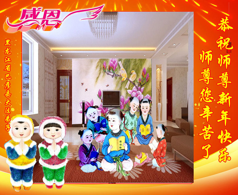 感谢师尊救度之恩!我们永远听师尊的话,对大法坚如磐石,一修到底,跟恩师回家。 黑龙江省哈尔滨市双城市二家三代大法弟子恭祝慈悲伟大的师父过年好!