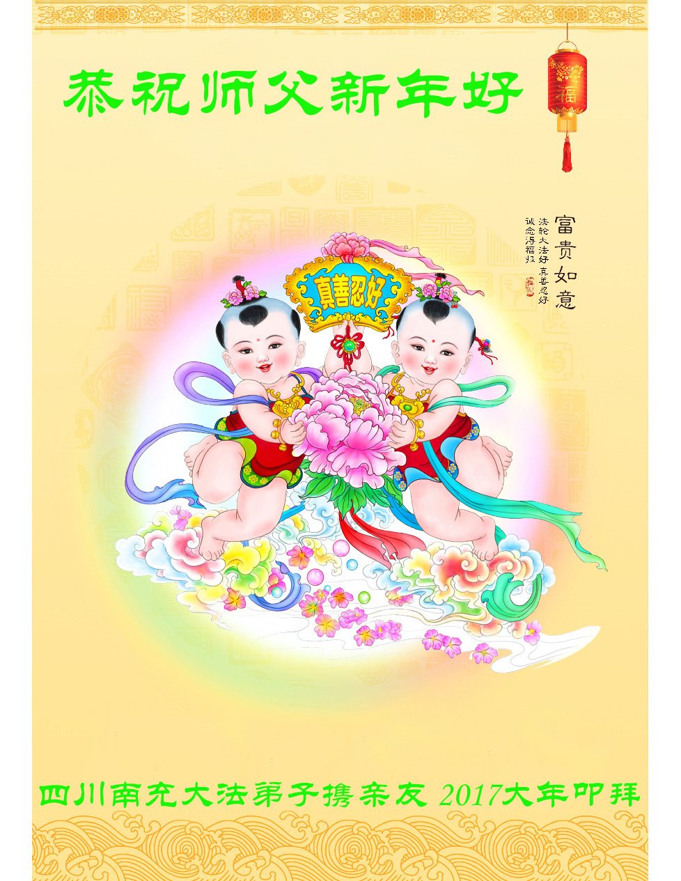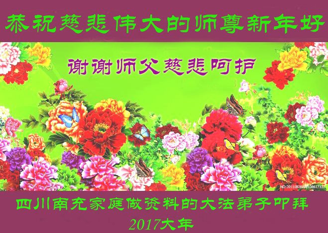 在新的一年里,弟子将认真做到学好法、发正念、讲真相三件事,用真善忍要求自己,去除执着。感谢师父替我们承受了那些本该我们承受的极端痛苦,弟子唯有认真做好三件事来回报师恩。 四川省资阳市安岳县一大法弟子代表全家和所有明白相的亲朋好友恭祝慈悲伟大师尊新年快乐!