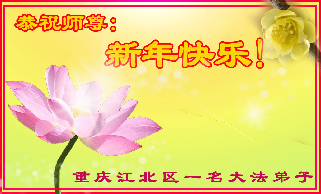 尊敬的慈悲伟大的师父好!师父辛苦了!感恩师父!谢谢师父慈悲苦度。在新的一年里,我们一定努力精進,做好三件事,愿师父少一些操劳,多一份欢心。千言万语,万语千言感恩师父!谢谢师父! 重庆市江北区全体大法弟子恭祝师尊新年快乐!