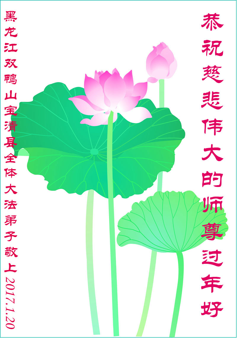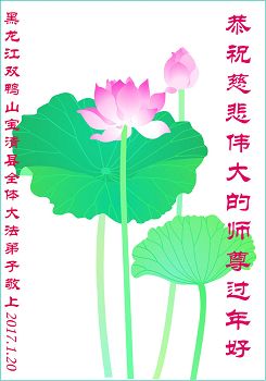 师父您辛苦了!我们在这新的一年里一定走好您安排的修炼道路,做好三件事,完成自己的使命,跟师父回家。 黑龙江双鸭山市宝清县全体大法弟子恭祝师父过年好!