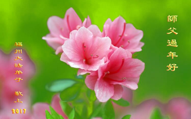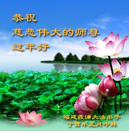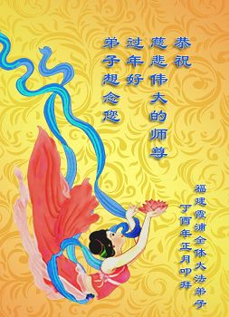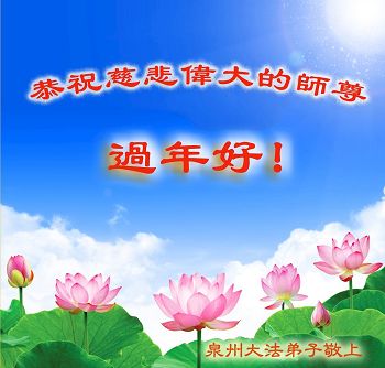 师尊您辛苦啦!我们期盼恩师早日回大陆和我们团聚。在新的一年里,我们谨记师尊的教诲,多学法,学好法,做好三件事,救度更多的众生,圆满随师还!弟子向师尊合十! 福建福州大法弟子恭祝伟大慈悲的师尊过年好!