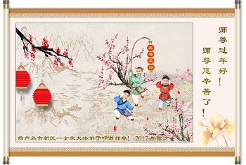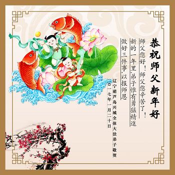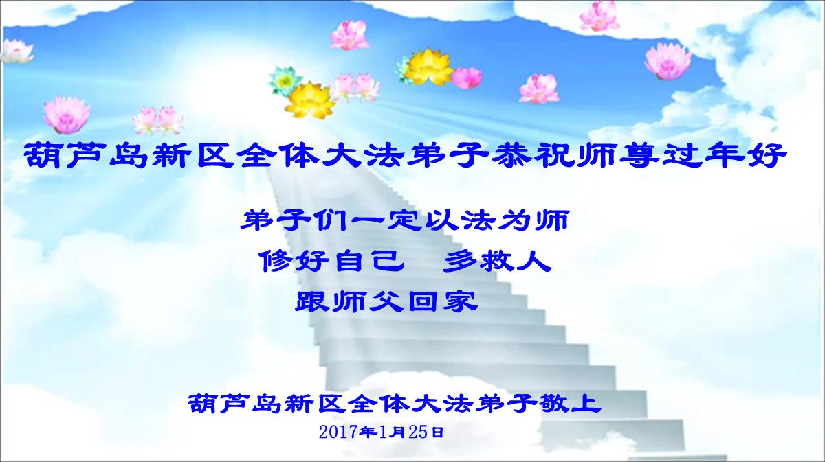 辽宁省葫芦岛市新区全体大法弟子恭祝师尊过年好! 弟子们一定以法为师,修好自己,多救人,跟师父回家。 葫芦岛新区全体大法弟子敬上 2017年1月25日 辽宁葫芦岛市大法弟子恭祝慈悲伟大的师尊过年好!