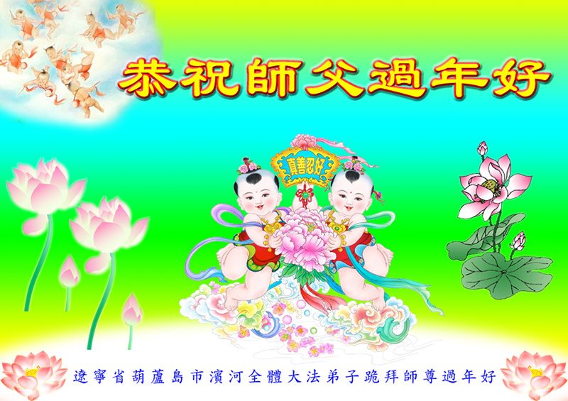 慈悲伟大的师尊:过年好! 又到了辞旧迎新的年关了。弟子向师父拜年。在最后不多的值千金值万金的宝贵时间里,弟子唯有精進、精進、再精進。感谢师尊一直的慈悲呵护,叩谢师尊过年好! 辽宁省葫芦岛市滨河全体大法弟子跪拜师尊过年好!