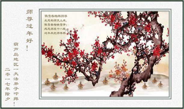 师尊过年好!师父新年快乐!葫芦岛地区全体大法弟子给师父拜年!浩荡洪恩中迎来了2017年。风雨兼程中,一路走过来,全是师尊慈悲呵护。这其中,溶灌着慈悲师尊的多少艰辛?您用最大的一切为宇宙苍穹众生、为弟子们付出着,承受着……。您用您那无量的慈悲,使一个个众生得救;并给了所有弟子们第二次生命!感恩师尊!师尊您辛苦了!谢谢师父!我们会珍惜这来之不易的神圣万古机缘,在师尊所赐与的这段宝贵时间里,我们一定要学好法,时时以法为师,事事用法对照,去掉各种人心和执着,修炼中不断的向内找,修好一思一念,修好自己,不断提高心性与升华。发好正念,清除破坏大法与危害众生的一切邪恶。慈悲挽救众生,讲好真相唤醒更多世人。助师正法中正念正行,精進不停。弟子们决不辜负师父希望,不负来世使命,证实法救众生中兑现神圣誓约。以回报师尊慈悲救度之恩!谢谢师父!葫芦岛地区全体大法弟子合十敬拜! 辽宁省葫芦岛市新区全体大法弟子恭祝师尊过年好!