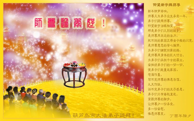 仰望新宇拜师尊 新年钟声将响, 师尊又为弟子众生承受一年, 弟子们跪拜师尊, 仰望新宇泪眼相望, 那是弟子们久别的故乡。 是师尊用无边的法力, 把不纯的家园正得金子般的闪亮, 是师尊慈悲的苦心操劳, 为弟子们铺就回家的路, 是师尊用身体的巨大付出, 为弟子们承担千古的罪业, 安排好弟子们的一切一切, 使弟子们能重返家园。 沧海作墨, 写不完师尊的佛恩浩荡, 九天作纸, 诉不完弟子们的无尽感恩。 弟子们只有奋起直追, 紧跟师尊的脚步, 让师尊少一份承受, 多一份安慰, 惟愿师尊笑。 葫芦岛市大法弟子叩谢师尊! 辽宁省葫芦岛绥中一学法小组大法弟子恭祝慈悲伟大的师尊新年快乐!