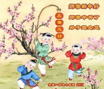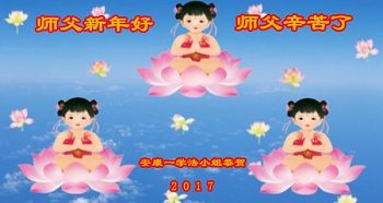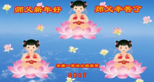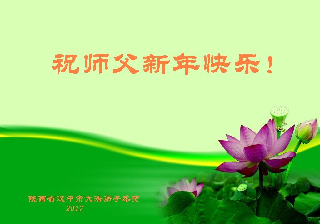 在二零一七年新春佳节到来之际,我们宝鸡大法弟子金陵学法小组全体学员向您衷心祝愿!恭祝师尊新年快乐!我们代表宝鸡全体大法弟子喜迎师尊早日回中原!我们多么想念您啊!感恩师尊“佛恩浩荡”! 三百六十五天,您为我们操尽了心,慈悲引领、呵护我们走在神的路上。师父的正法進程已接近尾声,我们要更加精進,修好自己,抓紧救人,多救人,用正念正行来回报您,赐予您给予我们的一切!圆满跟随师父回家园! 陕西省宝鸡市金陵学法小组全体大法弟子敬贺 陕西省汉中市镇巴县大法弟子敬谢师父,祝师父新年快乐!