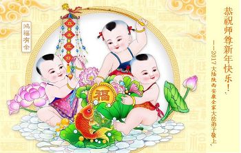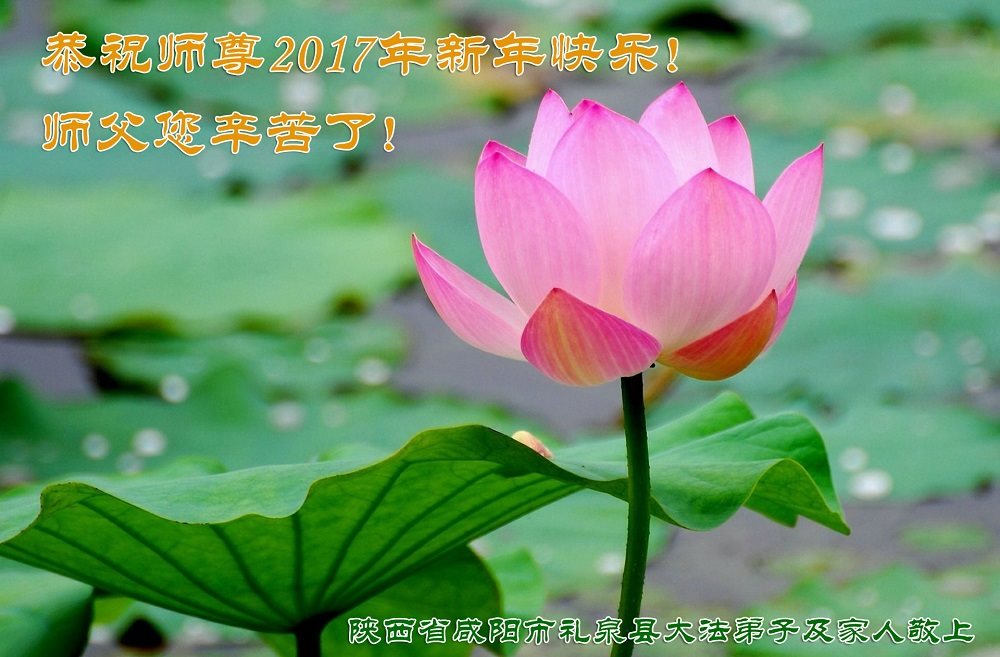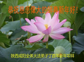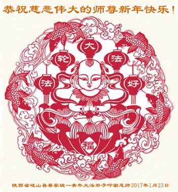恭祝神圣伟大的师尊新年好! 在二零一七年新春来临之际,我们向神圣、伟大的师尊拜年,问候致以最崇高的敬意,在新的一年里,我们要更加坚定的跟随师尊走正、走好、走稳修炼的路请师尊放心,我们一定做好三件事,走正最后的路。功成圆满报师恩。 陕西宝鸡市姜谭路一学法小组敬上 陕西神木全体大法弟子恭祝慈悲伟大的师尊新年快乐!