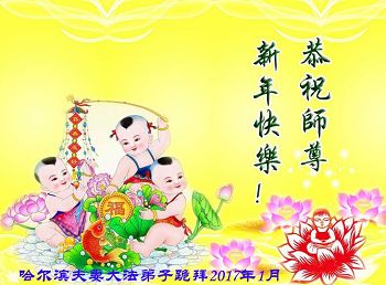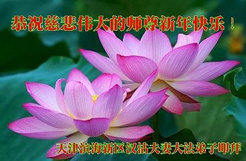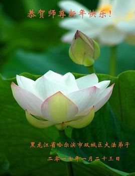恭祝师父新年快乐! 在这万家灯火,喜迎新年的大好日子里,我们想念师父,期盼师父,愿早日与师父团聚。二十年的正法路,师父为我们操尽了心,承受了难以承受的苦难,弟子们心中明白,弟子们心疼师父。这些年来弟子们在师父的指导下一步步走上了正法路,我们快乐!着忙碌着,不是师父您的千叮咛万嘱咐,哪有我们的今天。弟子们一定用心做好三件事,多救人,不辜负师父的殷切期望! 山东省临清市净莲学法小组敬上 黑龙江哈尔滨市双城区大法弟子恭祝师尊新年快乐!
