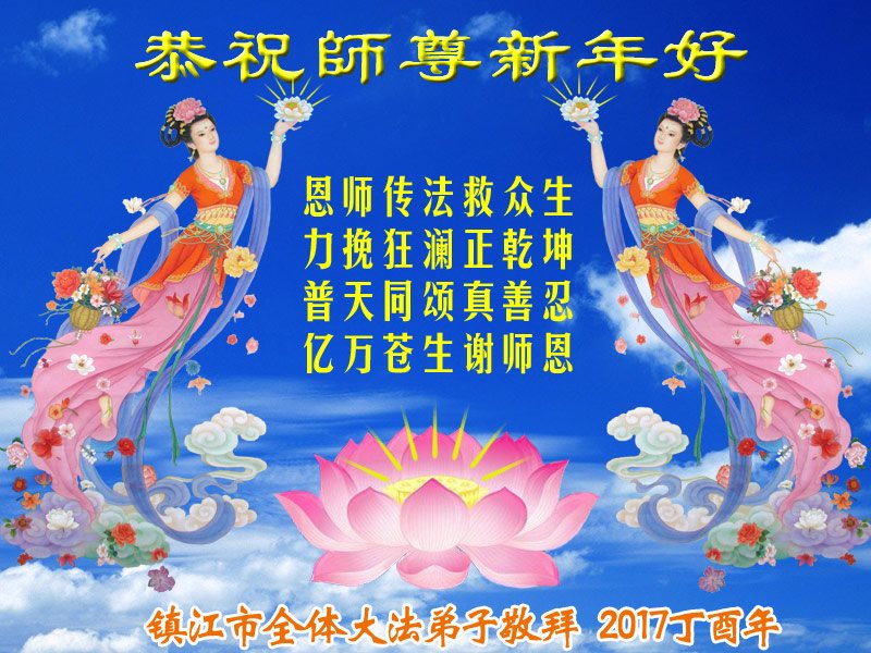 向慈悲伟大的师父拜年了!请师尊放心,在今后修炼的路上,我们时刻想着自己是修炼人,牢记我们的史前誓约。认认真真学好法,向内找,修好自己,精進实修。做好三件事,救度更多的众生。整体提高,整体升华,精進、再精進。 江苏省镇江市全体大法弟子恭祝慈悲伟大的师尊新年快乐!