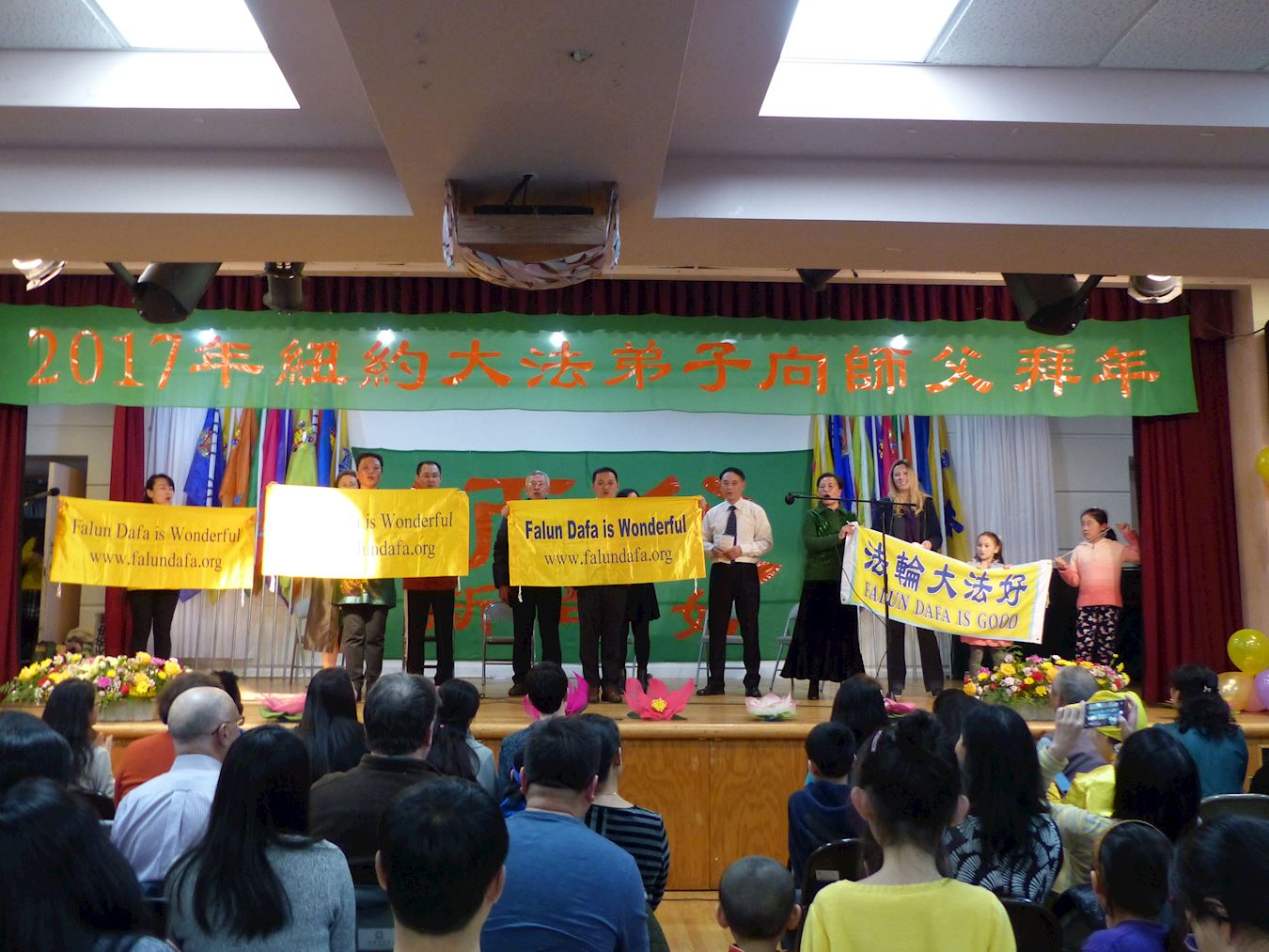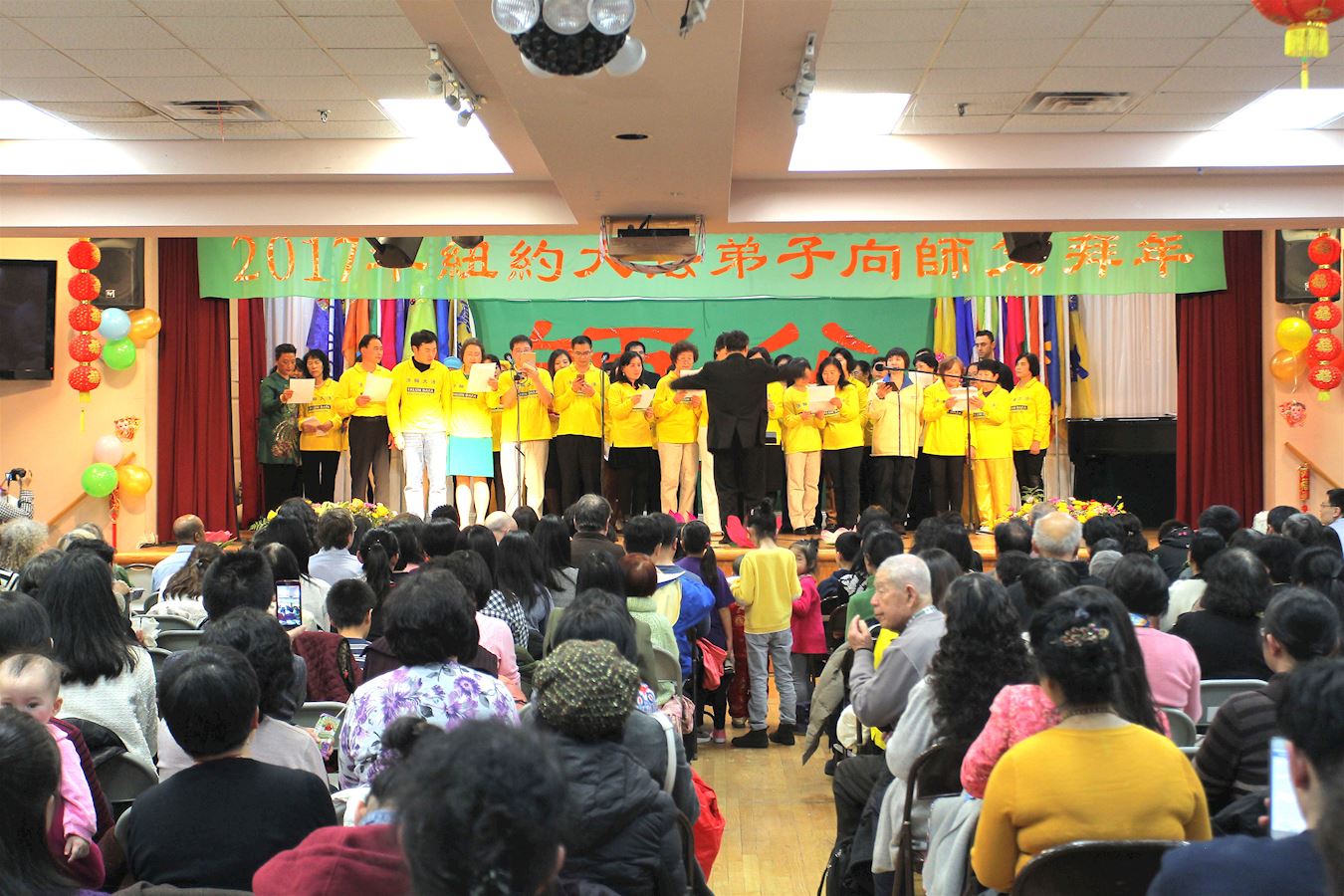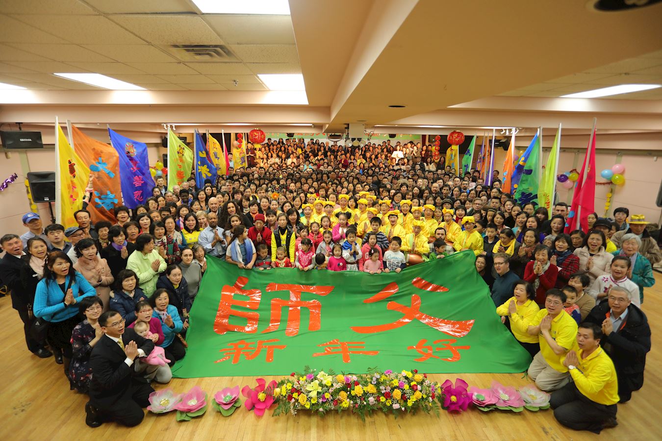每到新年,纽约法轮功学员都举办活动给师父拜年。当天,在法拉盛的台湾会馆大厅内外挤满了人,有白发苍苍的长者,也有三、四岁稚气未脱的孩童,也有妈妈带着襁褓中的婴儿,白裔、非裔、印度裔等,不同族裔的法轮功学员,从四面八方齐聚一堂。  图2-5:中国新年将近,二零一六年一月二十二日,部份纽约法轮功学员汇聚在法拉盛的台湾会馆举办庆祝活动,给李洪志师父拜年。 |