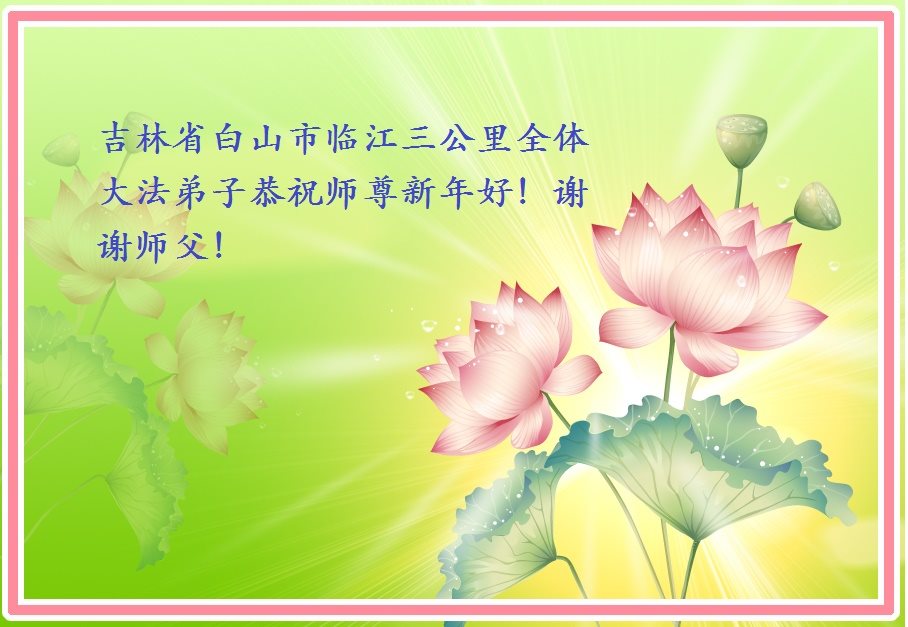 能够成为正法弟子跟随师尊救度众生,弟子深感荣幸。我们会珍惜这份机缘,努力助师正法! 在中共的谎言迷惑之下,很多很多的中国人还在被蒙骗着,等着我们去救度,我们知道,留给我们救人的时间其实并不多了!所以新的一年里,弟子会更加珍惜救人的机会,多学法,发正念,努力兑现自己的史前誓约! 感谢师尊的慈悲苦度,恭祝师尊过年好! 吉林省白山市临江一学法小组恭祝师尊过年好!