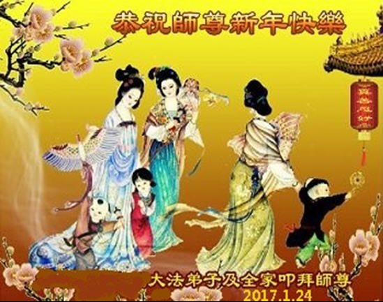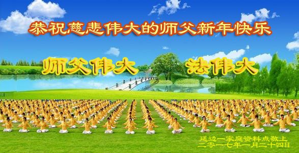伴随着师尊的洪恩浩荡,我们即将迎来二零一七年(黄历丁酉鸡年)中国传统新年,此时此刻,弟子坐在桌前禁不住的流泪,弟子深知,我们之所以能再一次迎来这传统的新年,是师父巨大的付出、承受与洪恩: 延时,延时……等待,等待……弟子无以报答师恩,只有默默的做好,做好! 走正,走正! 值此中国传统新年之际,弟子将这颗无限感恩师尊的心化作一首小小的诗,飞到师父身边,敬献给伟大、慈悲的师父,恭祝师父新年好!新年快乐! 谢师恩 漫步街头 人车如流 大年将至 货物采购 静观人影 悲泪涌流 大劫过后 几人能留 感恩师尊 转轮施救 正法数载 心血历呕 徒儿念师 哽咽泪流 更知任重 尽力抢救 心无时空 真念无求 大法洪恩 师德永留 再一次恭祝慈悲、伟大的师父过年好!新年开心、快乐! 吉林省公主岭市大法弟子感恩叩拜 吉林省通化市一夫妻大法弟子及家人恭祝师尊新年快乐!