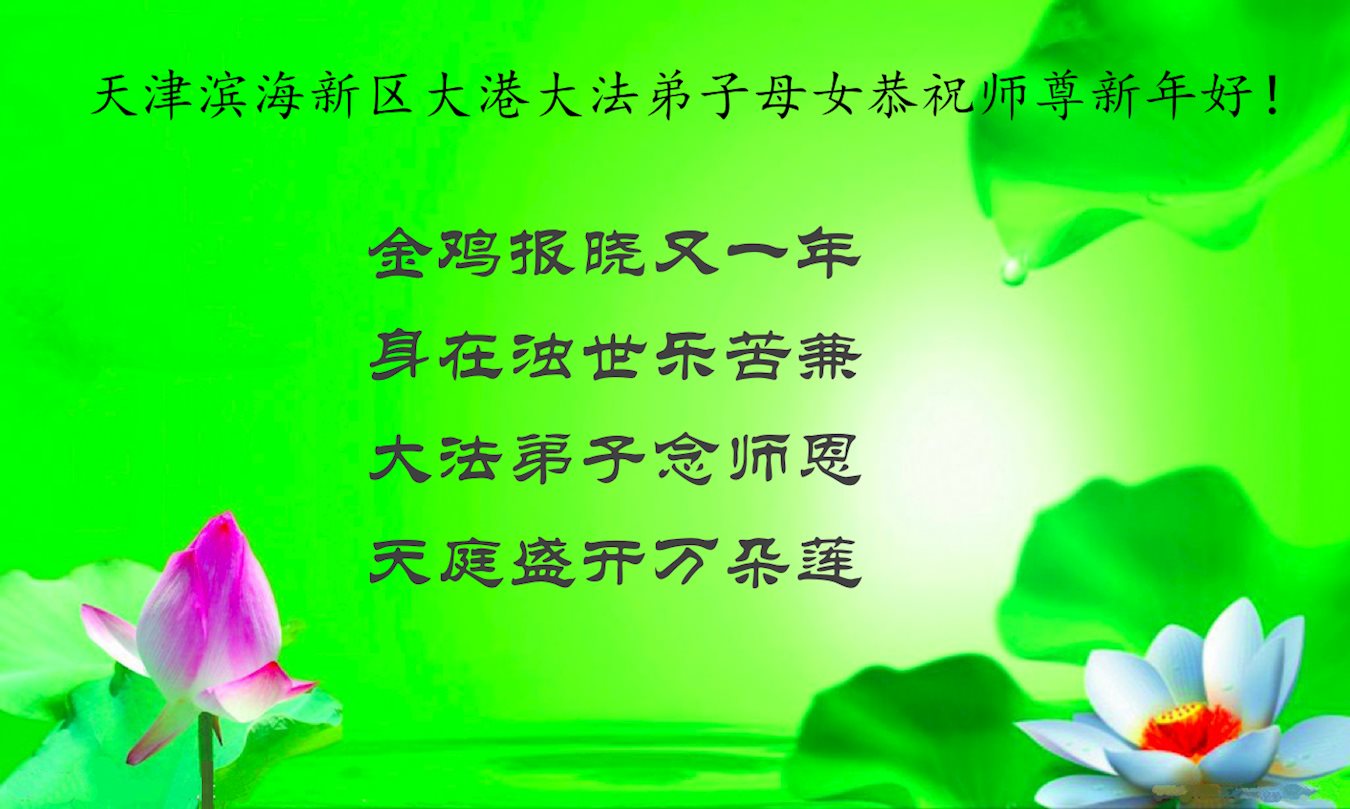 弟子深感师尊用巨大的付出一再延长着正法结束的时间,为的是尽最大力量救度更多的可贵的被中共毒害的中国人,也为弟子们的圆满增加着万古不遇的机会,请师尊放心,弟子们会万分珍惜这个修炼和救人的机会,真修自己,向内找,去掉各种执着,多救人,不负使命。 叩拜师尊 天津大港街在职学法小组大法弟子 天津市大法弟子恭祝师尊新年快乐!