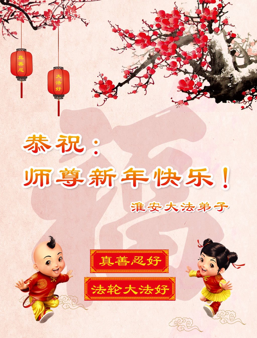 过年了,弟子想念师父。感恩的泪水如泉涌,感恩师父把我从污泥中拉出来洗净,牵着我的手走过坎坷、越过艰难、闯过死关,超越常人境界,思想不断升华。不管严寒酷暑,烈日盛夏,弟子十年如一日坚定的做着三件事。每天抱着一个不少,一百不多的信念,奔走于救人的路上。兑现自己的誓约,在一点一滴地完成自己的使命。一个目地,不辜负师父的救命之恩。 至今,弟子还有很多人念,执着存在,距师父要求相距甚远,但弟子有信心在有限时间内精進,再精進,把一份满意答卷交给师父。 祝师父过年好! 大陆苏州大法弟子 江苏淮安大法弟子恭祝师父新年快乐!