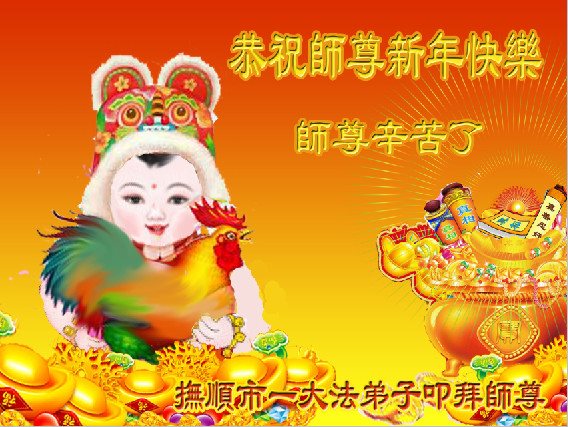 师尊好!恭祝师尊新年快乐!在新的一年里一定要修好自己听师尊的话,多救人,跟师父回家。 辽宁阜新二位(母女)大法弟子及家人恭祝师尊丁酉年新年快乐!