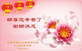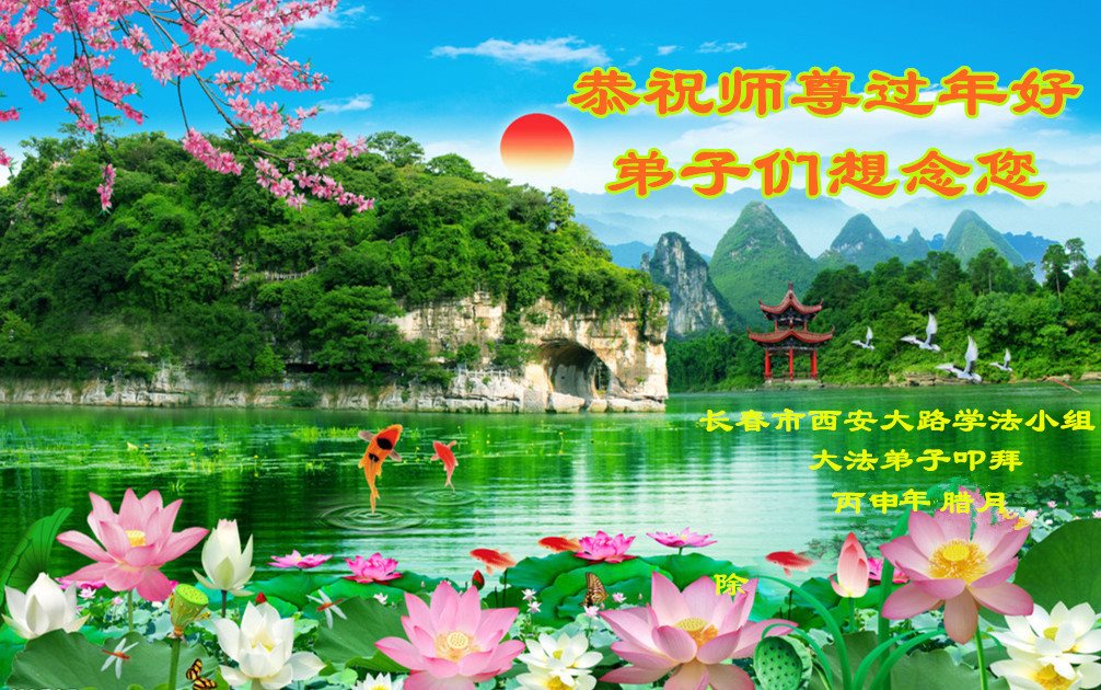 师尊过年好! 我们听师父的话,勇猛精進修好自己,做好三件事,完成自己的责任与使命。 长春市西安大路学法小组全体弟子叩拜。 丙申年腊月 吉林省长春大法弟子及亲属恭祝师尊过年好!