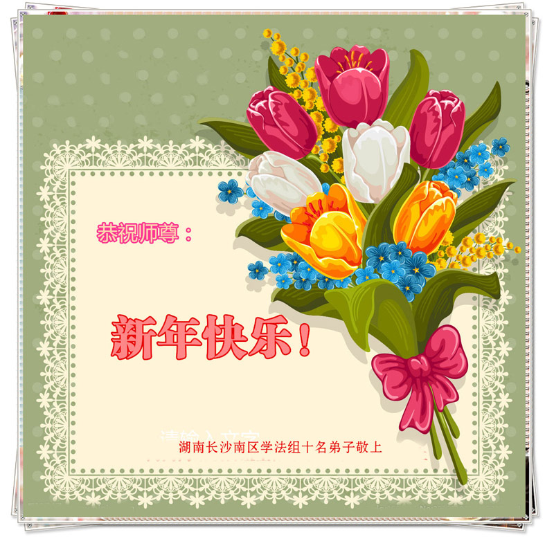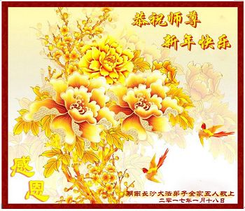 在这辞旧迎新的时刻,湖南长沙南区一学法小组全体大法弟子恭祝师尊新年好!师尊辛苦了!弟子们在伟大师尊的慈悲看护下又走过了一年。在新的一年里,请师尊放心,风雨中,弟子们会依然前行,抓紧时间,精進实修,多学法,多去人心,多救人。弟子们想念师尊!盼望师尊早日回到中国大陆!弟子们叩拜师尊!谢谢师尊苦度! 湖南长沙一家五名大法弟子恭祝师尊新年快乐!