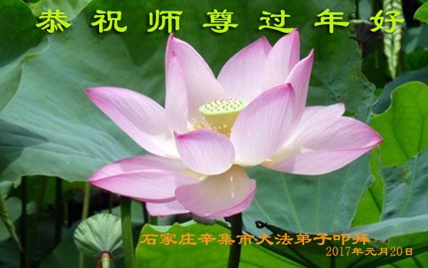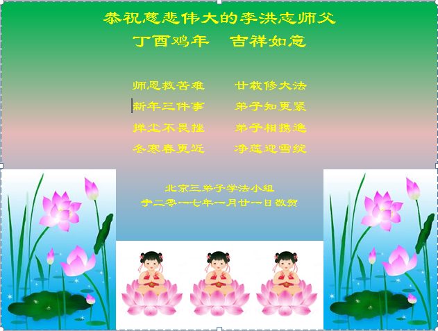 我们是丰台区的一个学法小组,在此恭祝慈悲伟大的李洪志师父丁酉鸡年吉祥如意! 赋诗一首以表达我们对师父最真诚的敬意和感恩! 师恩救苦难 廿载修大法 新年三件事 弟子知更紧 掸尘不畏挫 弟子相携進 冬寒春更近 净莲迎雪绽 北京三弟子学法小组 黑龙江大庆大法弟子及家人恭祝师尊过年好! 西江月·更新 丁酉鸡年来到 此时何事空前 纪元审判庆新年 除去腐虫一片 陆上海风云外 妖魔鬼怪全歼 坚持正信沁香莲 傲雪寒梅仙艳 河北石家庄一辛集市大法弟子恭祝师父过年好!