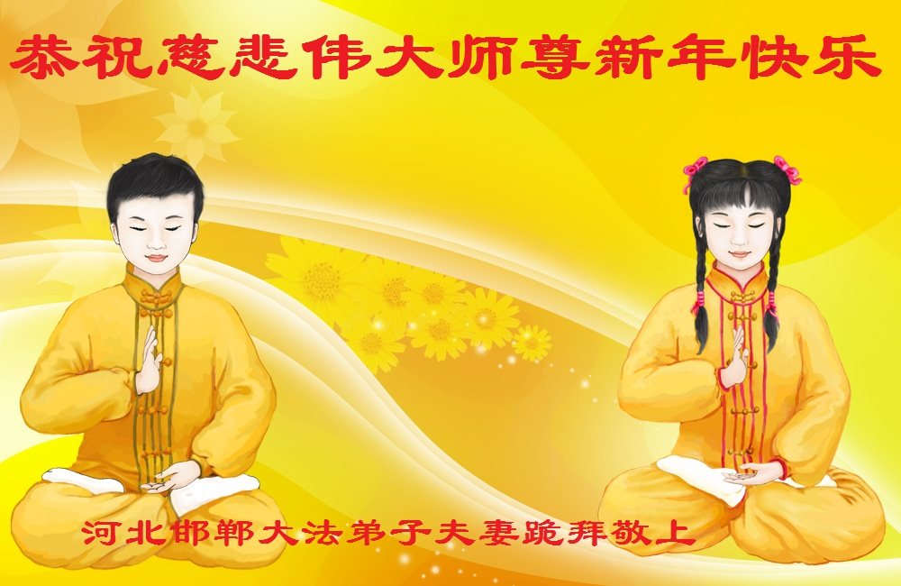 湖北省云梦县全体大法弟子恭祝师尊新年好!我们一定不辜负师尊的慈悲苦度,抓紧做好三件事,救度更多的有缘人。 河北邯郸大法弟子夫妻恭祝慈悲伟大的师尊新年快乐!