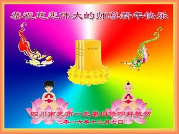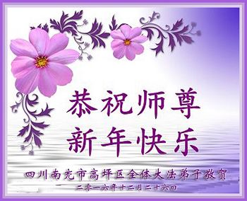 师父您好?师父辛苦了!我们以无限崇敬的心情感谢伟大师父的慈悲苦度。师恩浩荡无以回报,在新的一年,一定谨遵师父的教诲,任凭风云多变不被所迷,坚持学好法、修好自己,抓紧做好三件事多救人,正念正行走好最后的路。 四川成都双流全体大法弟子恭祝伟大慈悲的师父大年快乐!
