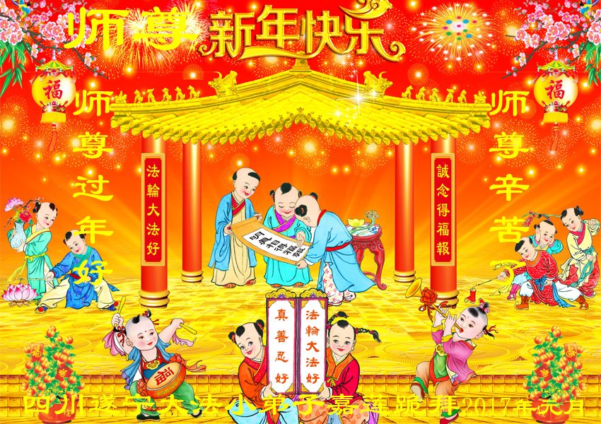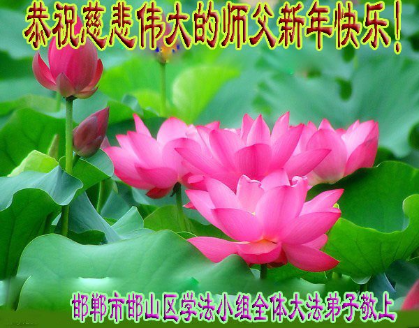 大连地区一家三口大法弟子祝师父新年好!在新的一年里要精進实修,学好法,做好三件事,圆满随师还。 山东省东营市胜北学法小组全体大法弟子向伟大的师尊拜年,祝师父新年快乐!