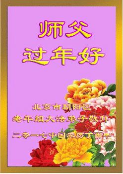 师尊新年快乐! 在十九年的腥风血雨中,我们学法小组跟随师尊走过快十七个年头。这期间有波折、有阻碍、也有教训,有师尊的一路看护我们走到今天,而且开出了枝繁叶茂的小花。 师尊,弟子们感激您,感谢师尊的慈悲救度,把弟子从地狱中捞出、洗净,使我们成为万分荣幸的大法徒。 弟子们请师尊放心:无论修炼的路还有多长,弟子们一定牢记师尊教诲,多学法学好法修好自己,兑现誓约言完成使命,圆满随师尊返回我们的天国家园。 弟子们叩拜师尊! 辽宁省抚顺市清原县城西大法弟子给师尊拜年!