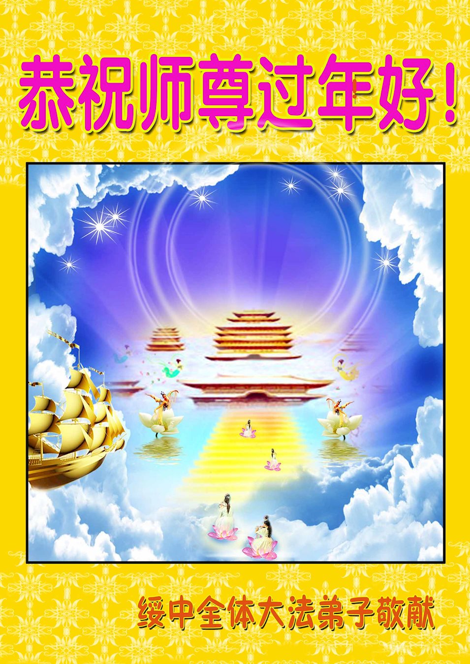 天津市宁河区大法弟子给师父拜年了!恭祝师父过年好!在新的一年里希望能让师父少一分操劳多一分欣慰,唯愿师尊笑!弟子叩拜师恩! 辽宁省辽阳市宏伟区一老年大法弟子恭祝慈悲伟大的师尊新年好!
