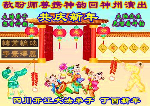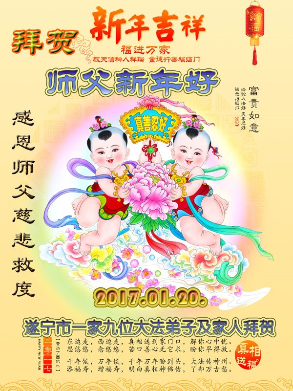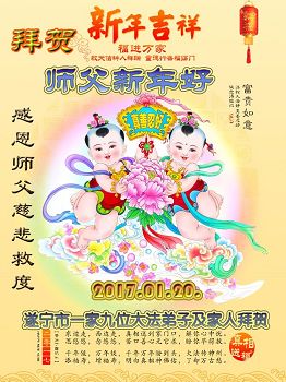 值此中国新年即将到来之际,遂宁市一家九位大法弟子及家人,向慈悲伟大的师父致以新年的问候:师父新年好!恭祝师父新年快乐! 我们万分感恩师父慈悲救度,慈悲加持,慈悲点化,慈悲看护! 并敬献感怀诗一首,以谢师恩: 中国夏历丁酉金鸡年新年感怀 金鸡报晓新年到,得救众生乐涛涛 问声师尊新年好,弟子奋進志气高 乘胜追击灭邪恶,救度众生不辞劳 使命责任担在肩,助师正法洪愿了 每天做好三件事,一思一念法对照 时时事事修心性,修己救人向内找 感恩师尊救度苦,不负使命要记牢 共同精進报师恩,慰我师尊新年好 欢庆中国新年时,再拜师尊新年好 新年弟子更精進,愿我师尊多分笑 与师共庆金鸡年,随师正法洪愿了 感恩感恩再感恩,沐浴师恩众生笑 遂宁市一家九位大法弟子及家人拜贺 河南省周口市老弟子恭祝师尊新年快乐!