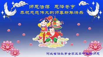 师尊过年好! 在此弟子携全家十一口人恭祝师尊新年快乐! 过年了,弟子们想念您,我们给您拜年了! 二十多年的修炼路,师父带我们度过一个一个难关,闯过一个一个坎,用尽人间语言也无法表达我们全家对师尊的感恩,在新的一年里,弟子一定遵师命,修好自己,尽力做好三件事,不辱使命,不辜负师尊对我们的期望,圆满随师还! 山东省临清市一大法弟子全家敬上 山东兖矿集团东滩学法小组叩拜:恭祝慈悲伟大的师尊过年好!